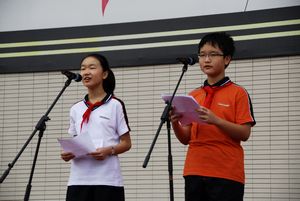 初一薛仅一、张天依两位同学代表新生发言,他们向全校师生表示他们将从现在开始,以新学期为起点,认真学习,快乐生活,以崭新的姿态开始他们“北京东路的日子”。