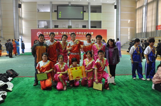 2011年11月25日至27日,我校武术队一行12人前往丹阳九中,参加“丹阳九中”杯江苏省中学生第四届武术比赛。比赛中,我校武术队队员不畏强手、顽强拼搏,经过激烈的竞争,获得了高中组集体拳术与集体棍术两项二等奖的好成绩,并获得了“体育道德风尚奖”。
