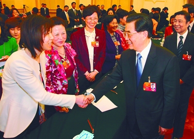 胡锦涛总书记与出席十一届全国人大五次会议的江苏代表团亲切交谈(前排左二为我校朱善萍代表)