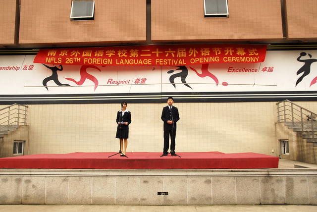 首先我宣布:南京外国语学校第二十六届外语节现在开幕。(停顿、翻译——英、德、日、法)