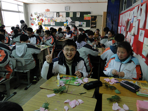 下图为同学们上课认真做花的场景
