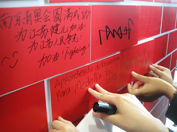了南外同学的介绍后,市长们都表示很有兴趣为青奥会写下寄语并签名。市长们在和南京城墙砖块同等