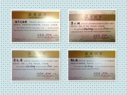 第二届全国语言学奥林匹克竞赛于5月19日在清华大学落下帷幕,共有来自全国各省市的近两百名高中生参加了此次比赛。南京外国语学校语言学社派出4名同学参加竞赛,曹起曈、茅子桐获得全国一等奖(First Prize),戴昊、张婧仪获得全国二等奖(Second Prize)。曹起曈同学同时获得个人赛最高奖——单项解题奖(Best Solutions) 并将代表中国参加今年7月在英国曼彻斯特举行的第11届国际语言学奥林匹克竞赛(International Linguistics Olympiad)。此外,南京外国语学校荣获最佳语言实践活动奖(Best Linguistics Practice)。