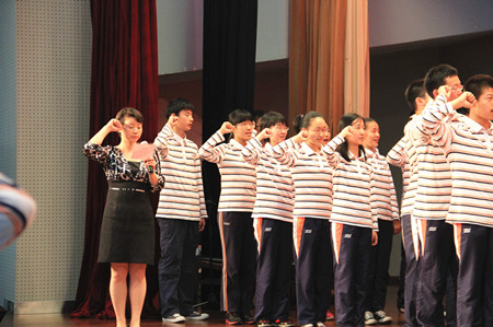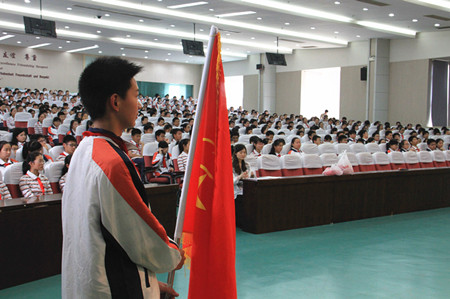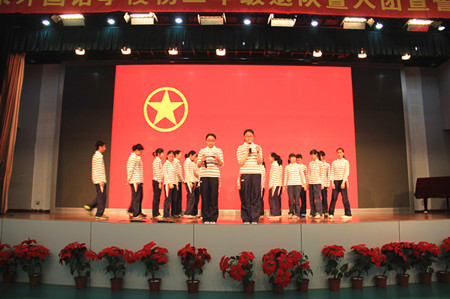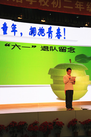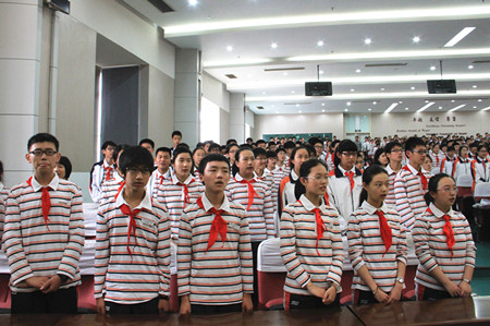 2013年5月31日,2011届初二全体同学相聚在报告厅,迎来了人生最重要的转折点——少先队退队暨新团员入团仪式。全体同学在大队辅导员的带领下,摘下在胸前飘扬了七年的红领巾,作为一份珍贵的记忆珍藏。随后,第一批60名及第二批121名新团员面对鲜红的团旗庄严宣誓。仪式结束后,全体同学观看了励志的电影片段《风雨哈佛路》,作为“六一”活动的最后一项内容。