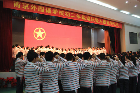 少先队员退队暨新团员入团仪式是初二年级的大事。摘下红领巾,我们便告别了童年;而在团旗下宣誓,更拉开了我们青年时代的帷幕。