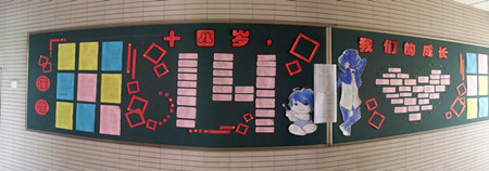 走入教学楼二、三楼,初二年级新一期的板报格外亮眼。这是一期关注成长、聚焦青春的祝福和憧憬的主题板报,由“学生对十四岁的自己说”和“家长对十四岁的孩子说”两部分组成,分别错落地摆列成“14”的字样和爱心的形状。