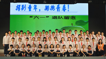 当同学们在报告厅的舞台上全班合影时,从那一张张笑脸上不难发现恋恋不舍的表情——这将是我们最后一次佩戴红领巾、以少先队员的身份合照了。