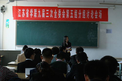 2014年4月1日,江苏省学生联合会第九届委员会第三次全体会议在江苏徐州的中国矿业大学召开。我校高三韦安麒同学作为学生代表参加了此次大会,听取了省学联对于新时期如何开展学生会工作的指导意见。另外,韦安麒作为我校代表,主持了中学学生会代表的分组会议,对于大会上团省委姜东同志的讲话、省学联主席帅鑫代表作的工作报告以及多项文件草案进行了热烈的讨论。