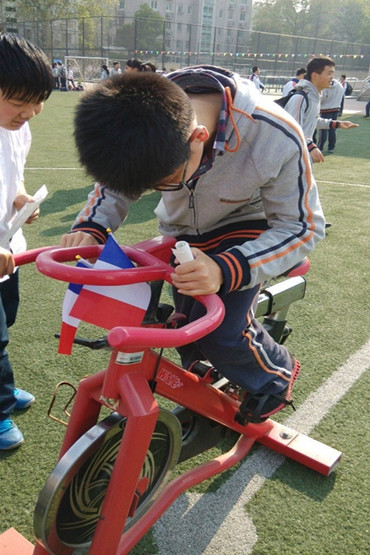 法国小屋要突出的主题是“健康的生活方式”,灵感来源于法国街道上大量的自行车,意在倡导世界的青年朋友运动起来,营造健康的生活氛围,养成有益身心的生活方式。小屋中的动感单车、独轮车等游戏项目吸引了很多同学前来尝试。他们都在小屋的“健康生活承诺树”上印上了自己的手印。