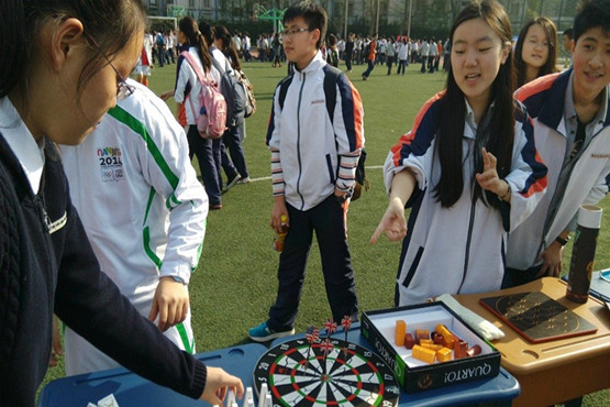4月4日下午,以“分享青春,拥抱世界”为主题的外语节外语角“青奥世界行”活动在南外操场举行。学校四十个班级参与承办一个国家的文化小屋,宣传各国文化,以良好的精神面貌迎接青奥。作为我校三个同心结小屋之一,法国小屋的互动活动测试吸引了学生们的踊跃参与,在一小时左右的活动时间里,我们接待了300多名同学。现场人流如潮,参与气氛热烈,成为活动中一道亮丽的风景。