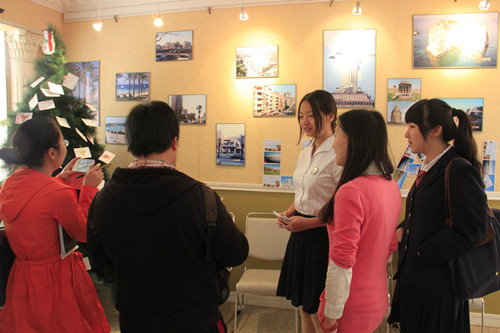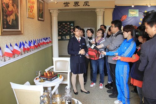 结对情况介绍之后,文化教育代表带领记者们参观了学校的“世界风”展厅。为了配合青奥同心结以及文化小屋的宣传活动,“世界风”展厅里布置了黎巴嫩、法国和图瓦卢三个国家的文化展。通过简单的氛围营造和装饰布置,同学们可以感受到我们对这三个国家文化特点的理解和小屋设计理念。