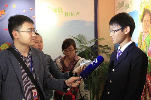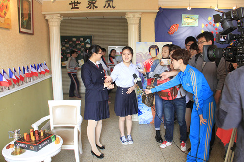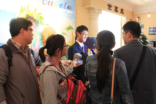4月29日上午,数家媒体记者团前来我校采访青奥文化同心结活动进展情况。学校党委刘前树书记和团委尹荷蓉书记以及部分文化教育代表负责接待了此次媒体采访。刘书记对我校学生广泛参与青奥活动、主动发挥作用、热情投入青奥各项工作进行了充分的肯定。团委尹荷蓉老师介绍了我校的同心结活动的组织情况。随后由黎巴嫩小屋的曹儒清同学、法国小屋的张粲同学以及图瓦卢小屋的洪子欣同学向来访记者们介绍了我们与对方国家友好学校进行结对的故事。在结对的过程中,同学们遇到了种种阻碍和困难,但是大家并没有因此而放弃,坚持通过各个渠道搜集讯息,建立通道。目前我校已成功与位于黎巴嫩首都贝鲁特的穆塞特贝赫中学,以及位于法国斯特拉斯堡市的让斯特拉姆中学建立了友好学校关系。与图瓦卢人的交流和沟通也在进行之中。