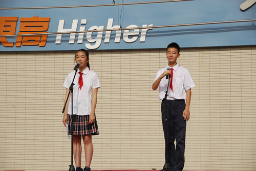 女:六月,是童年的梦乡,在深深浅浅的梦里,初一同学放飞进校一年来的梦想,初二同学告别鲜艳的红领巾,在团旗下成长。
