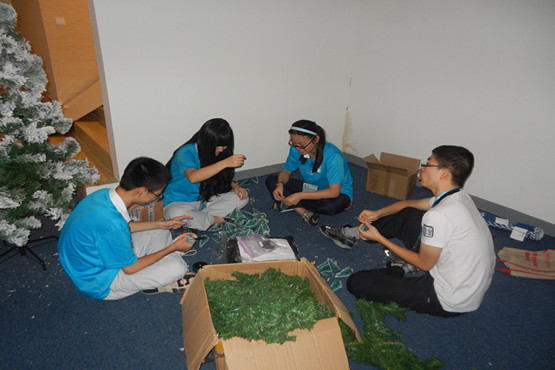 刚进入小屋时同学们全都吓了一跳,昏暗的灯光,地上横七竖八的塑料板,看来我们晚上要熬通宵了。可是事虽多,同学们共同努力似乎也就没那么辛苦了。你搬桌子,我挂雪松,大家从不松懈,个个干得热火朝天。夜深了,想象中的埋头苦干被欢声笑语取代,我们边忙边聊,聊学校,聊青奥,聊趣事,聊未来。在这个逐渐成型的黎巴嫩小屋里,没有学长学妹的年龄差异,没有学习成绩的优劣距离,只剩下活力与友情在黑暗中熠熠生辉。