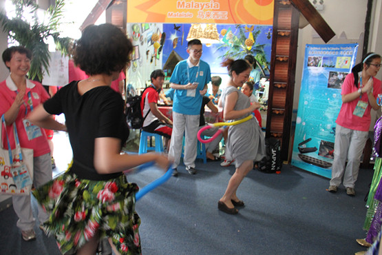 “Lebanon!”随着一声欢呼,身穿红色运动装的黎巴嫩运动员火一般涌入。他们在小屋成员的带领下十分兴奋地参观了“流金岁月”展示区、大力称赞了现场黎巴嫩特色舞蹈表演,之后很快投入了互动环节。一位高个子运动员,兴致勃勃地尝试起了软呼啦圈。他双臂高举过头顶,努力地摆动腰胯,得意地小步挪了一圈向大家炫耀成功浮在腰间的软呼啦圈。 “Two!”“Three!”在周围此起彼伏叫好声中,他先后共在腰上带动了三个呼啦圈,从腰腹一直转到小腿,五彩的软圈如炼蛇一般在有力的躯体上悬浮流过。“Good job!”人群又爆发出一阵简直要掀翻屋顶的喝彩与掌声!在他的鼓励下,之后又一名阿尔及利亚运动员挑战成功。