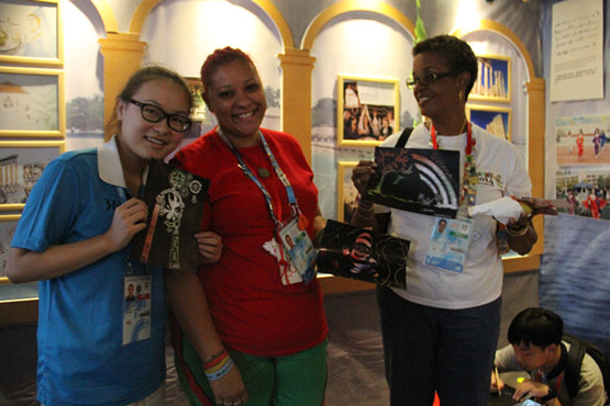 上午文化小屋运行启动不久,两名圭亚那游泳教练员便被黎巴嫩小屋中展示的特色刮画吸引,在小屋成员的简单示范后,兴致勃勃地开始了创作。一位教练刮出了一只笨拙可爱的砳砳和“YOG DNA”标志,另一位刮出了美丽的植物花边。我们在交谈中了解到,圭亚那本次派出了一男一女两名运动员参加游泳项目的比赛,均取得喜人的好成绩。两名教练还赞叹了南京玄武湖的怡人景色,并在成员们的鼓励下,把它画入了自己的作品。