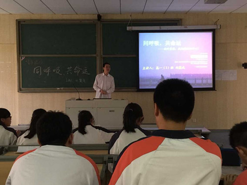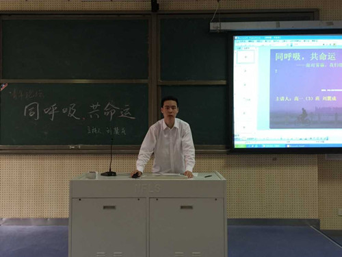 2015年5月11日下午,高一(3)班的刘麓成同学在E3楼阶梯教室主持了以“同呼吸,共命运”为主题的青年论坛活动。