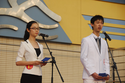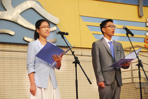 担任主席PK计时提醒工作的是改委会高二年级自荐代表胡瑞成和高一年级代表石裕琪,在倒计时10秒时,计时的同学将会举手示意,请候选人注意不要超时。下面有请1号主席候选人陈宇豪、杨以宁进行陈述。计时开始!