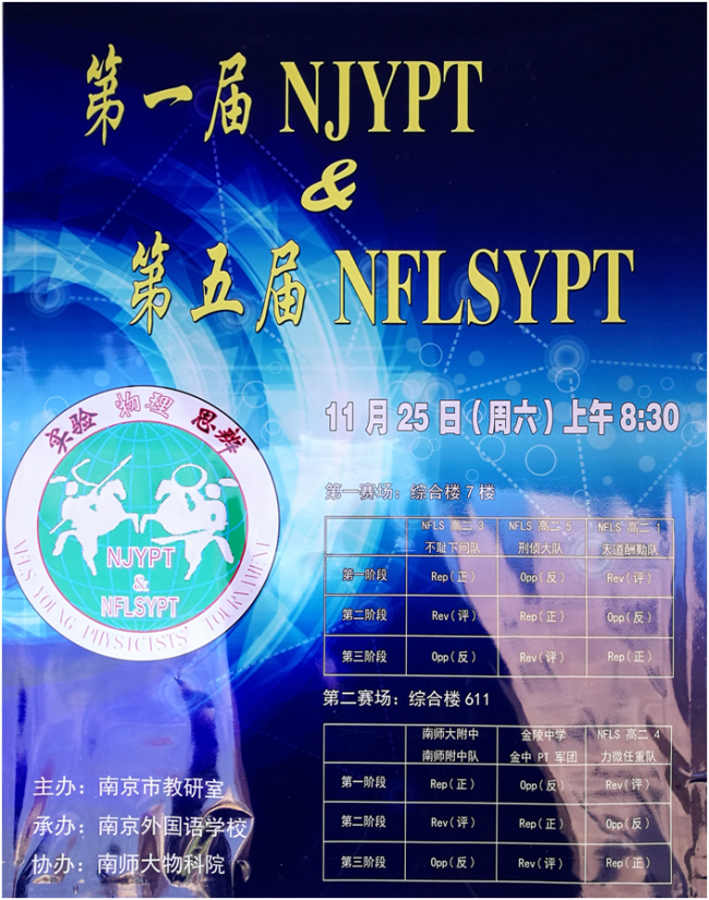在科技节的浪潮中,近日由南京市教研室主办,南师大物科院协办,南京外国语学校承办的第一届南京市高中生物理学术创新竞赛(NJYPT-1)暨第五届南京外国语学校青年物理学家锦标赛(NFLSYPT-5)于南京外国语学校的综合楼有序开展,于上周六上午最终落下帷幕。