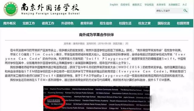 在2016年南外作为全国唯一的一所公立学校获得了苹果公司的支持,依托STEM+项目开设了苹果合作课程Everyone Can Code。学生在STEM+系列课程中,通过选修课用全新的方式学习代码编写,将新技术与计算机学科融合,提升STEM素养。胡清阳是该选修课的一名学生。