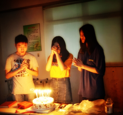 既然是集体生日,没有蛋糕怎么行呢?学校为这次活动也是煞费苦心,准备了蛋糕和许愿瓶。点点星星的蜡烛光闪烁了起来,直到18簇火焰一齐发出温暖的红光。灯忽地熄灭了,大家一同唱起生日歌,望着三位主角在烛光中吹灭了蜡烛。短暂的黑暗后灯复亮起来,紧接着就是吃蛋糕了,本次活动也接近尾声。这时人数不多的优势就体现出来了,每个老师和同学都分到了满满一碟蛋糕。