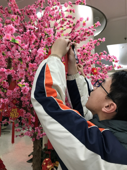 同学们在幸福树上写下新年愿望。