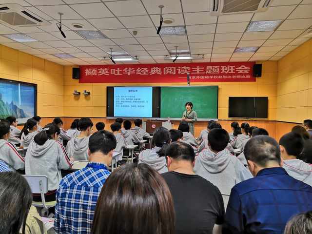 随后,我校赵思达老师给初一(6)班的同学们开展了一场“撷英吐华、经典阅读”的主题班会。万州教师进修学院、南京中学所在教研片区10所中学的德育管理团队现场观摩了这节班会课。