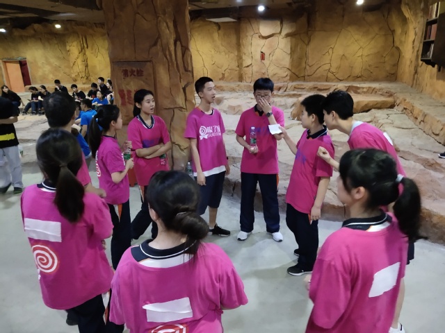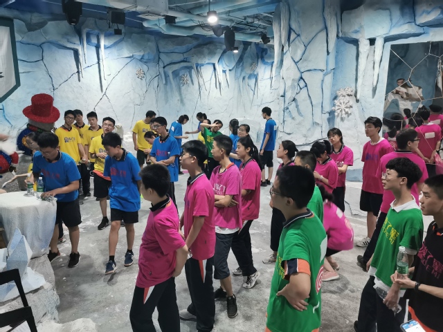 寻宝活动遗憾并快乐着,“宝物”藏在了火焰山和冰雪天地两个地方,我们队迅速分散开来各处寻找。趁大家都还聚集在冰雪天地的时候,我们在火焰山找到了3个纸条(火焰山一共埋了4个纸条)。稍后我们蓝队集合汇总手中的纸条,看是否能凑成英文单词,但可惜没有一个英文单词可以凑成。最终没有任何一个队伍达成目标,但看着手中的那么多纸条都是大家费尽心机寻来的,我们心里的满足感是沉甸甸的。此时老师告诉我们,可以和其他小组的纸条进行互换来完成任务,这让我们深深地体会了此次团建的真正意义。