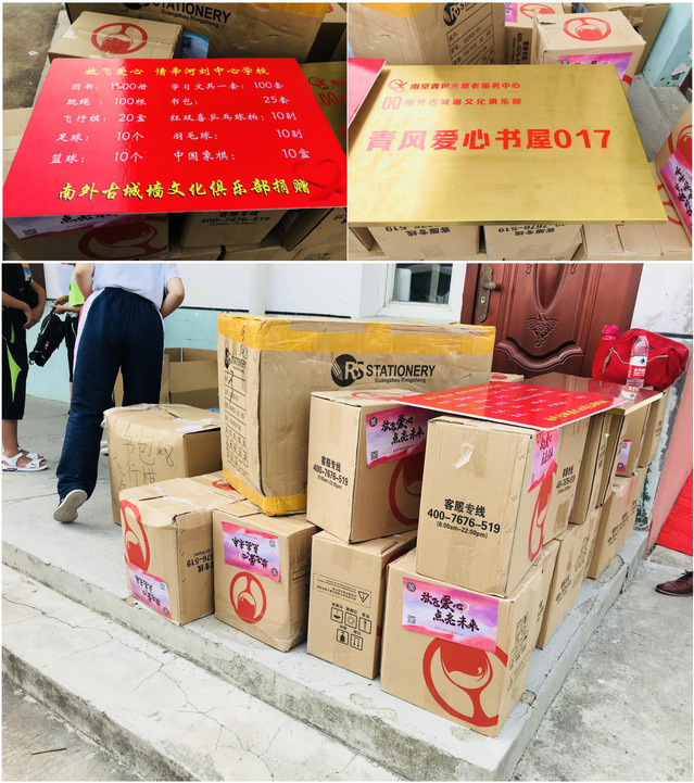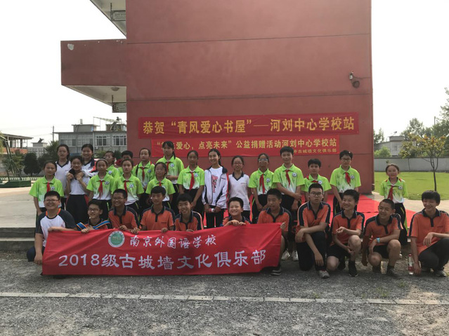 2019年6月27日,南外古城墙文化俱乐部组织16位学生代表南外2018级415名同学的心愿,前往马鞍山市含山县河刘中心学校开展“放飞爱心,点亮未来”活动。该项活动得到了马鞍山市团委、南京青风志愿者服务中心、河刘中心学校的大力支持,“情暖童心”关爱保护农村留守儿童工程,助力精准扶贫,让更多留守儿童敢于有梦、勇于追梦、勤于圆梦。活动从策划到完成经历了2个多月,南外初一的400多名学生以及众多爱心家长积极参与,该项活动圆满完成。