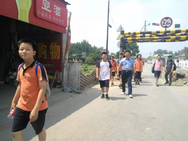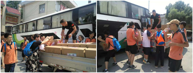 同学们经过3个小时的颠簸,终于快要抵达目的地,眼看河刘中心学校就在河的对岸,但桥上一道限高标识挡住了我们大巴最后2公里的行程,我们被迫停在了路边,联系了一辆小皮卡,重新将车上的满满几十箱的物资和书籍搬上小皮卡,然后再徒步过桥走向河刘中心学校。中午的骄阳似火,但同学们步履坚定,大踏步的走向河刘中心学校。