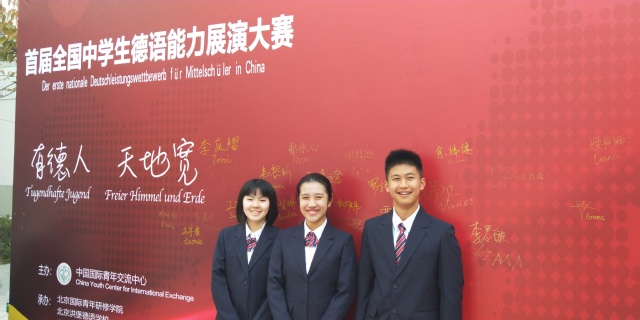 11月23日,秋色正浓的南京古城迎来了首届中学生德语能力展演活动南方赛区的比赛。我校高一德班冯宇瑄、盖雨璠、李庭熠以及高二德班周梓越等4名同学参加了这次演讲比赛,在自己的认真准备和老师们的悉心指导下,分获一、二、三等奖。其中冯宇瑄获一等奖、盖雨璠获二等奖、周梓越和李庭熠获三等奖。
