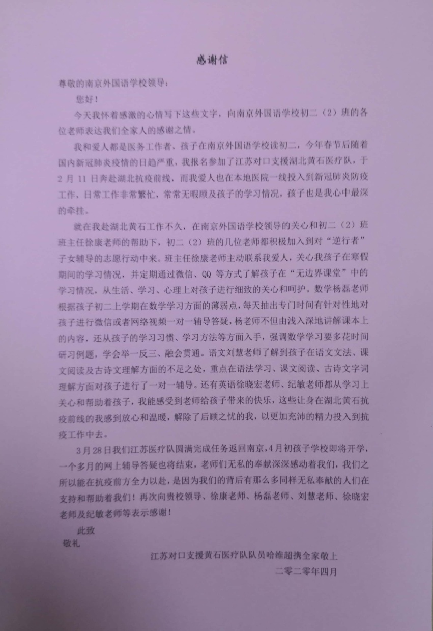 圆满完成援鄂任务的哈睿涵同学家长,在回到南京后了解到这一个月来自己孩子的学习生活情况,很是感动,专门将一面锦旗和一份感谢信送到了初二年级老师的手上。