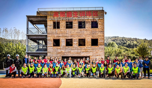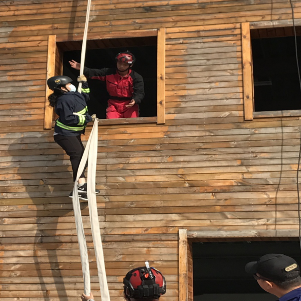 当天下午,我们就迎来了最“刺激”的项目——高层逃生课程。望着三层木质小楼,很多老师都流露出的畏惧情绪。教官当即问及有无老师有恐高,很多老师都举起了手,教官接着追问:“这是医院诊断结果吗?”,“你的症状是怎样的?”。一番对话下来,教官微笑着说:“大家表达的都是害怕,而不是恐高。今天的训练就是帮大家克服害怕的极好机会。”随后在教官的耐心讲解和热情鼓励下,三位男老师率先完成了消防水带下降,女老师们也陆续跟上。我校李炜老师一马当先,戴上防护手套,走上二楼,极为标准地完成了消防水带下降。此后的绳索下降和软梯下降,大家都更为顺利地完成了。与此同时,教官还教授了我们一些基础绳结,如八字结、蛇口结、防脱节。
