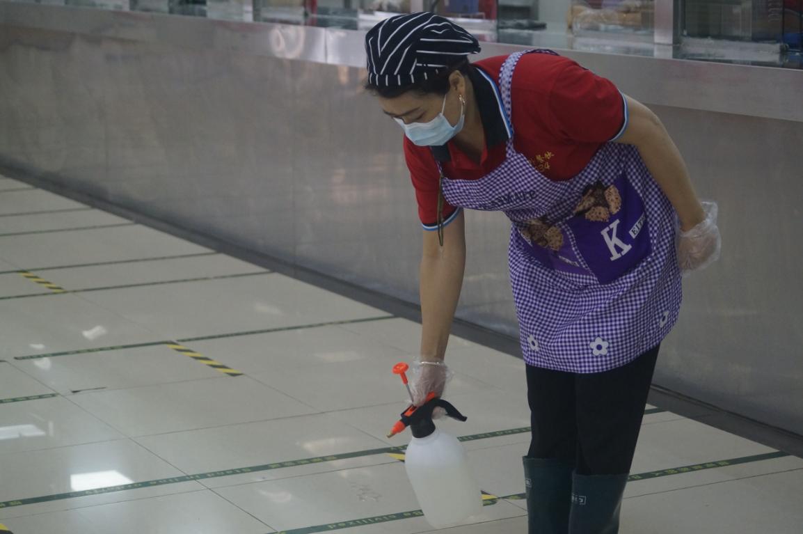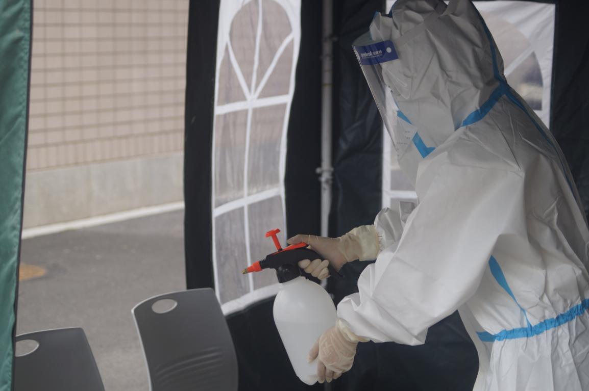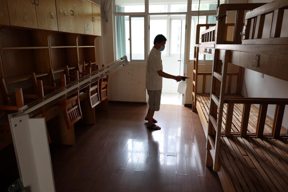 患病学生离开隔离区后,物业保洁人员立即用84消毒液喷洒、紫外线灯照射、通风等措施进行隔离区消杀处理。
