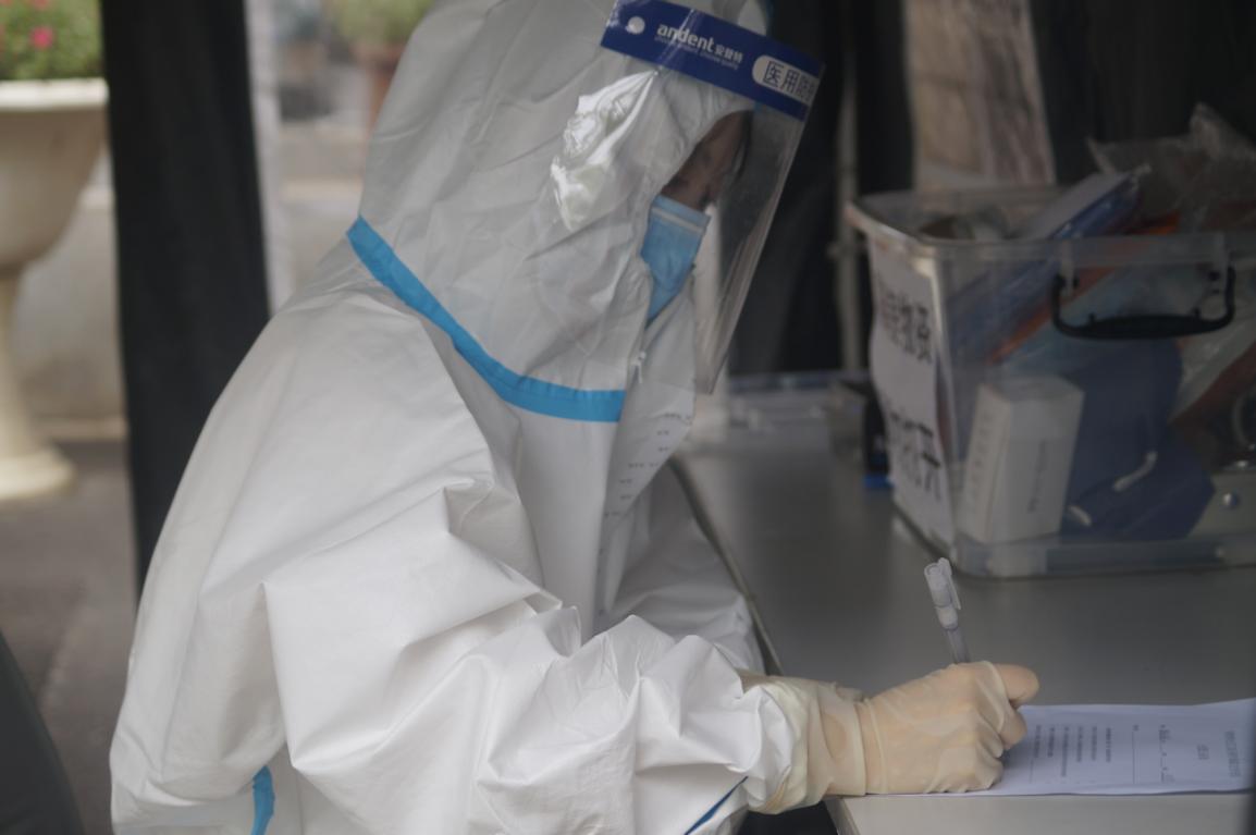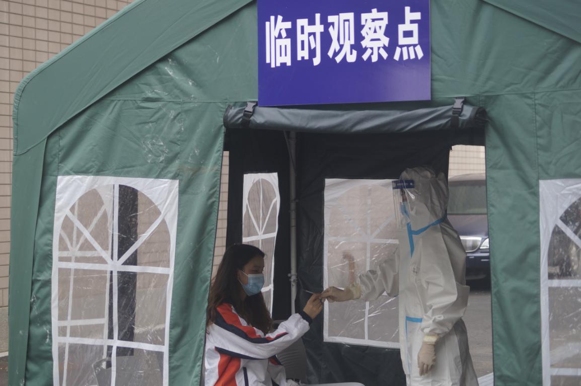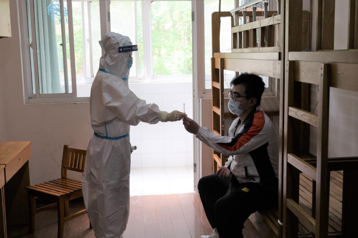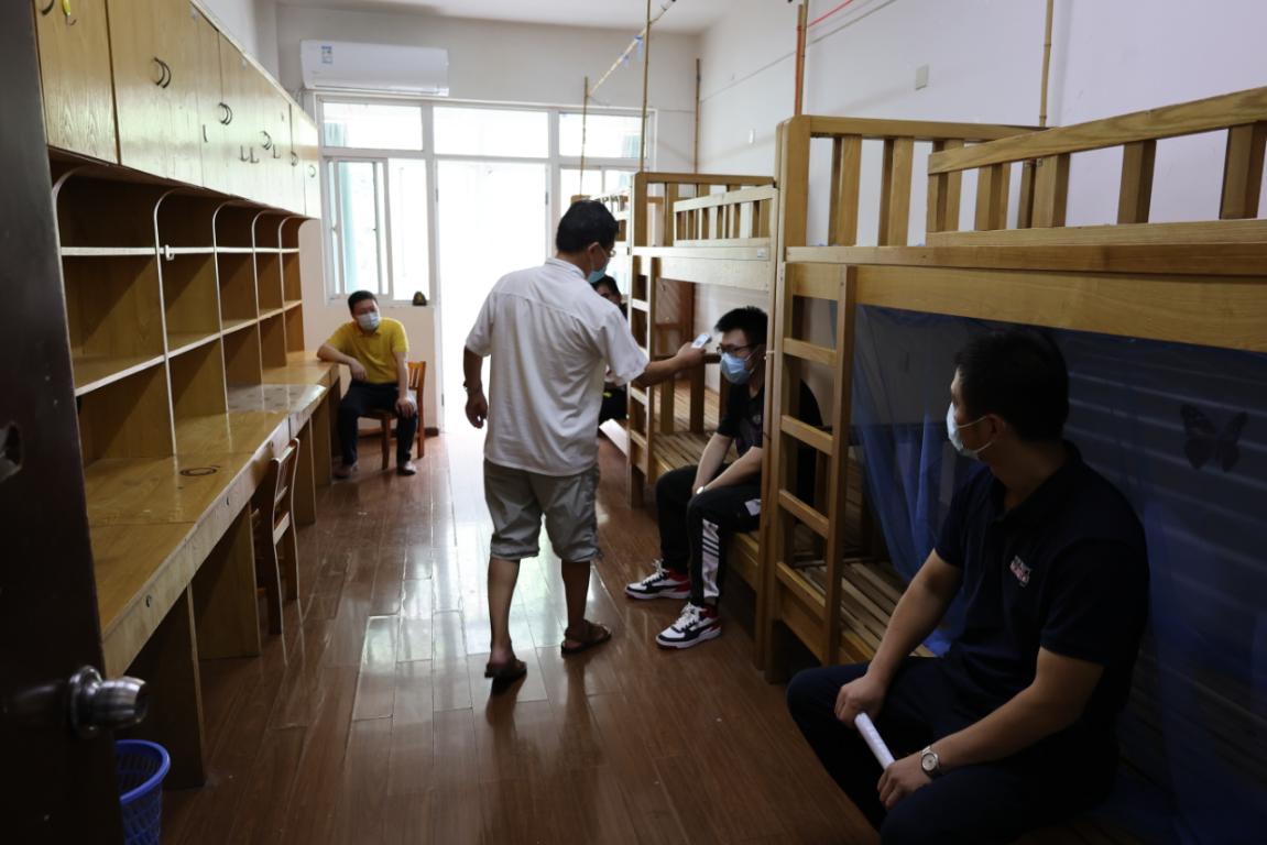 宿舍管理老师晚检时,使用额温枪监测学生体温,发现一名男生体温升高,立即通知校医及行政值班人员。同时将该生同宿舍的学生,疏散至备用宿舍。