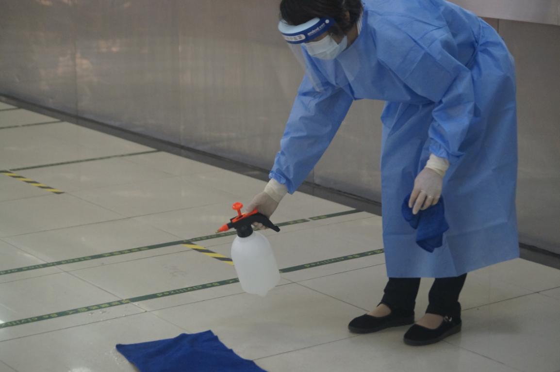物管使用84消毒液喷洒拖地、紫外线灯照射、加强通风等措施对高一(1)班教室进行消杀。
