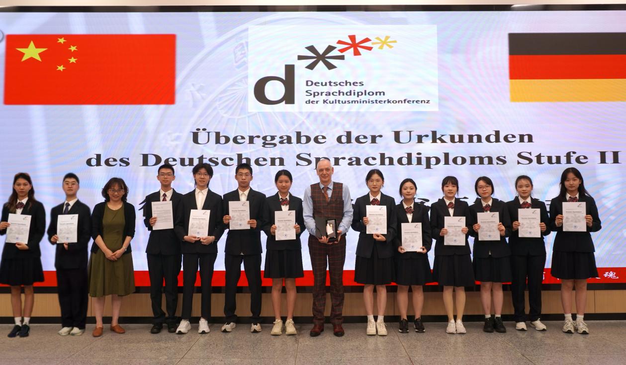 图为南京外国语学校连凯副校长、德国驻沪总领馆文化教育处处长/科教领事Uwe Koch先生为我校2025届德班毕业生颁发DSD二级证书
