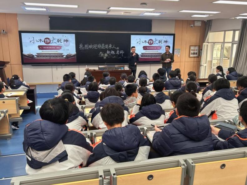 11月18日,赵老师在北校区二楼阶梯教室为初一至初三的部分班级带来了《小木作,大乾坤》精彩讲座,一个小时里,赵老师生动讲述了他的师傅——一位大国工匠及其团队修复珍贵文物的经历。同学们仿佛亲临文物修复现场,感受到修复师们日复一日严谨专注、精益求精的工匠精神:正是他们以青春与汗水默默守护文化遗产,才让一件件破损的文物“修旧如旧”,重现光华,使我们今天仍能领略历史的温度与艺术的辉煌。赵老师语言风趣,讲座过程中掌声不断,气氛热烈。