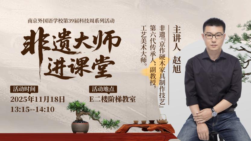 为庆祝南外第39届科技节,并迎接即将在12月到来的南外艺术节,通用技术教研组与艺术教研组联合推出了一系列融合艺术与科技的精彩活动。其中,“非遗大师进课堂”环节备受师生瞩目。本次特邀主讲人是非遗项目“京作硬木家具制作技艺”第六代传承人、工艺美术大师赵旭先生,他还有另一个引人瞩目的身份——《我在故宫修文物》中的文物修复师。本次活动激发了同学们浓厚的兴趣。