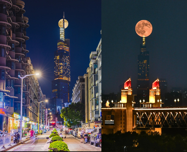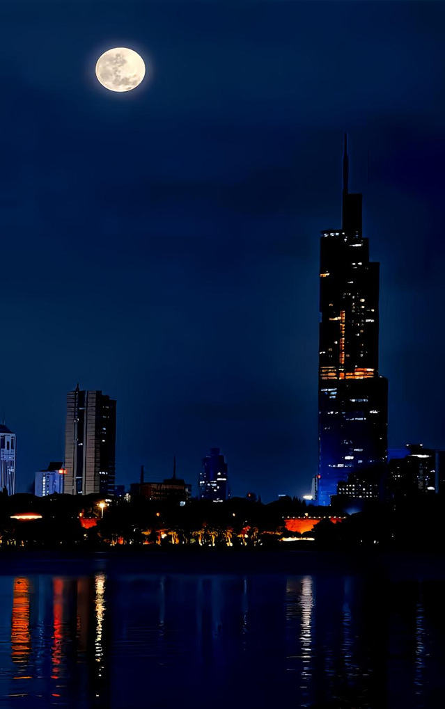 孙:是的!中秋之夜,我和家人漫步玄武湖畔,当皎洁的圆月悬在挺拔的紫峰大厦上空,银辉洒在湖面,灯火与月影交融,那一刻真的被震撼到了——玄武湖是自然的温婉,紫峰大厦是祖国发展的挺拔,形成了人与自然融合的美!于是我激动地拍下了这个难忘的瞬间,就形成了我的作品《紫峰揽月》。你拍摄时有没有这样的感受?